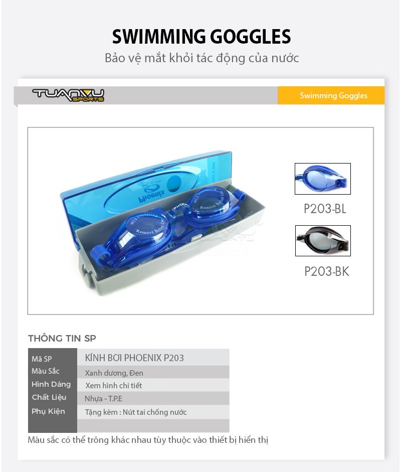 1. Thông tin sản phẩm:- Tên sản phẩm: Kính bơi Phoenix PN203- Hãng: Phoenix- Nhà phân phối: Tuấn Vũ Sport- Chất liệu: Polycarbonate + silicon - Size: Free size- Màu sắc: Xanh dương, đen- Giá bán: 140.000đ (miễn phí vận chuyển toàn quốc)2. Đặc điểm sản phẩm:- Kính...