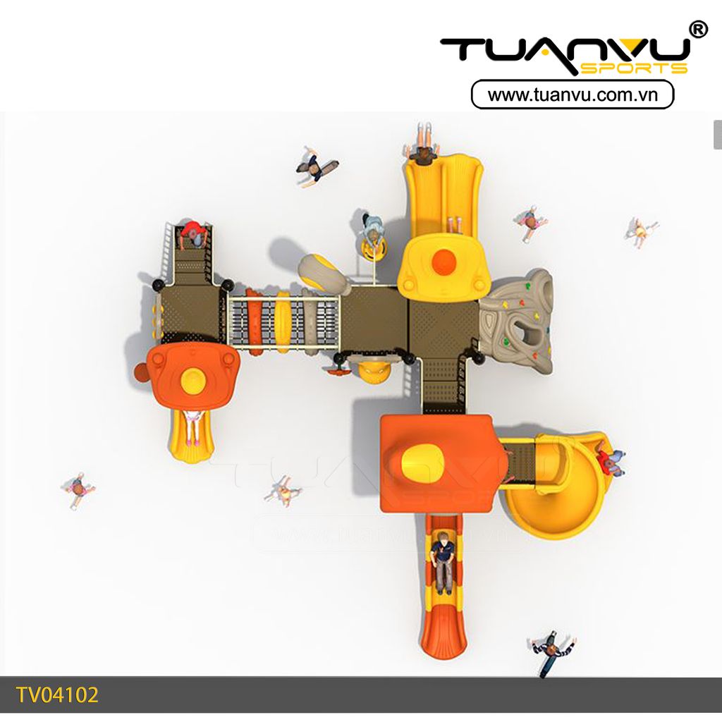 - Sân chơi mầm non TV04102 được thiết kế gồm các thành phần: Mái nhà, cầu trượt, tấm nhựa, cầu thang, sàn, ống trụ và leo núi.