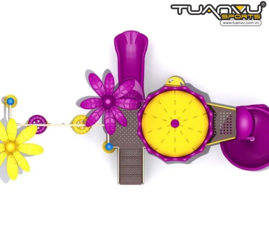 Cầu trượt xoắn ốc mở hai tầng trông giống như một xoáy nước. Nó sẽ mang đến cho trẻ em một chuyến đi hồi hộp, nhanh chóng. Bên cạnh là những chiếc xích đu hình lốp xe. Chúng là nơi tụ tập để trẻ em trò chuyện. Ngoài ra, hãy thêm trò chơi bập bênh, trò chơi xe lò xo và trò chơi leo dây. Chúng sẽ tạo nên một khu vui chơi thú vị cho trẻ em.