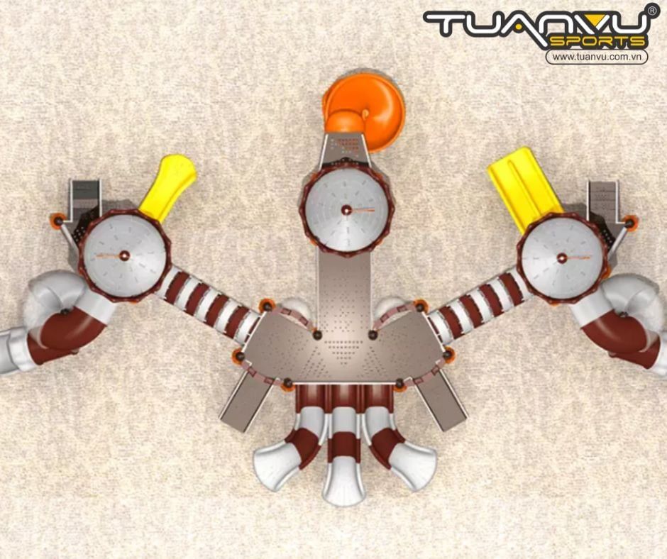 Cầu trượt có ba đường trượt dành cho ba trẻ em. Đây là phần bắt mắt nhất. Nó cho phép ba trẻ em trượt xuống cùng một lúc, giảm thời gian chờ đợi. Trẻ em có thể chơi các trò chơi hợp tác hoặc thi đấu với bạn bè của mình. Điều này sẽ tăng cường sự tương tác giữa các em.