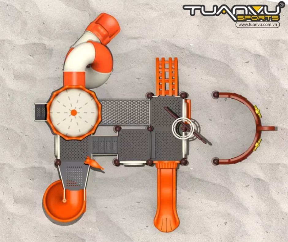 Đầu tiên, hãy đi về phía bên trái, có một khu leo ​​trèo màu cam, nơi trẻ em có thể sử dụng để rèn luyện khả năng leo trèo và phối hợp tay chân.