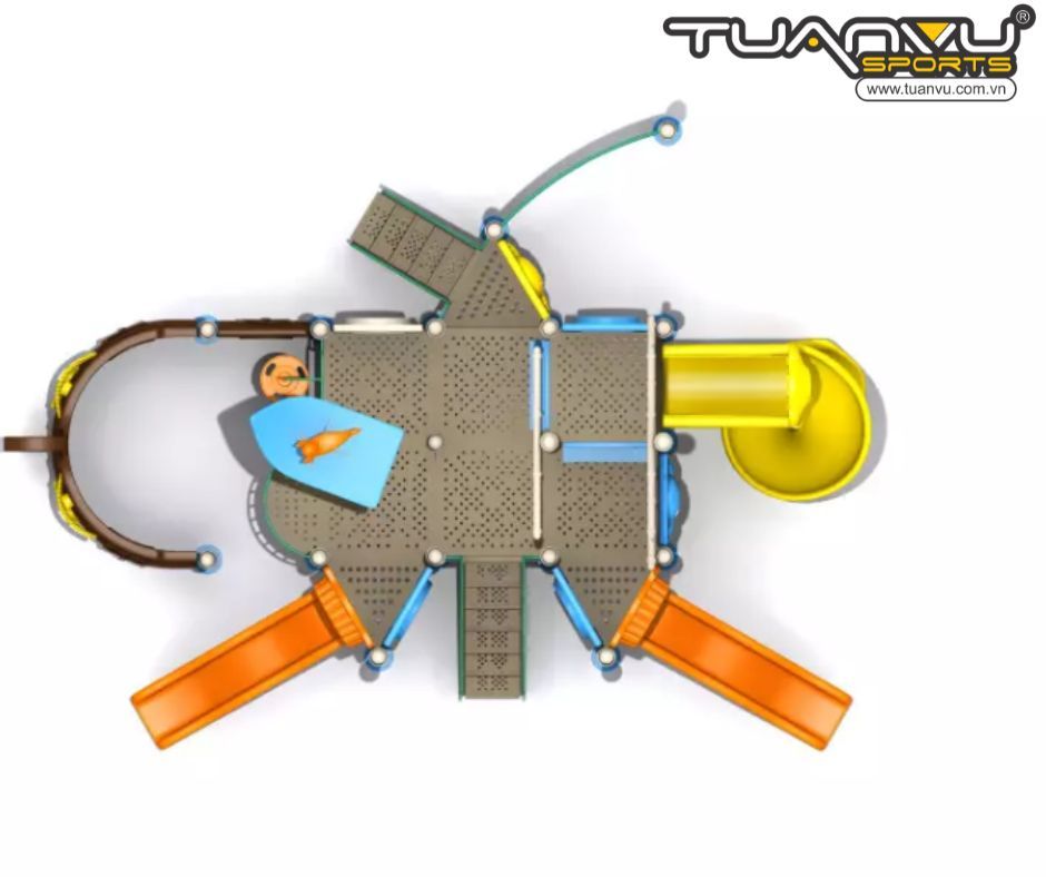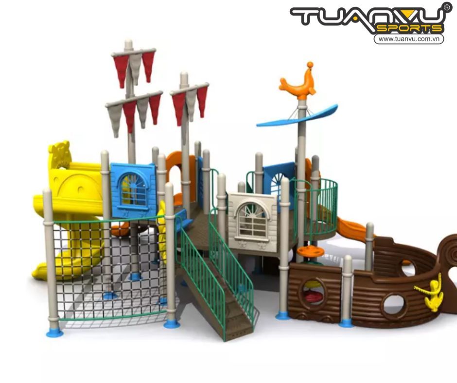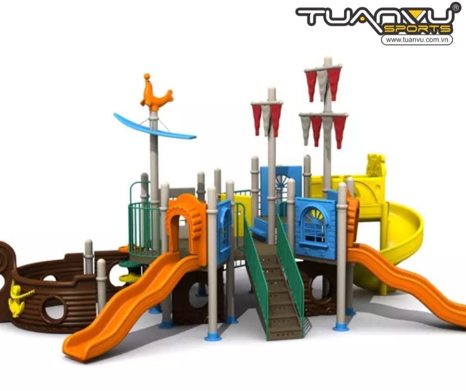 Đây là một khu vui chơi hình con tàu cướp biển hai tầng lớn, được thiết kế cho không gian công viên rộng mở và tạo ra một khu vực giao lưu tuyệt vời cho trẻ em. Những lá cờ đầy màu sắc và những cánh buồm căng cao cho thấy con tàu sắp ra khơi. Những chú hải cẩu sống động và mũi tàu rộng tạo ra một không gian giàu trí tưởng tượng cho trẻ em.
