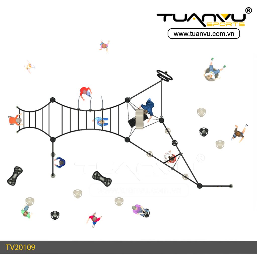- Thiết bị vận động thể chất ngoài trời cho trẻ TV20109 cung cấp cho trẻ một mô hình vui chơi vận động liên hoàn, các trò chơi và khu vận động được kết hợp với nhau tạo ra không gian vui chơi lý thú, giúp bé vừa được khám phá các trờ chơi vừa được vận động, rèn luyện thể lực, rèn luyện tư duy logic cũng như rèn luyện khả năng phối kết hợp các hoạt động cho bé.